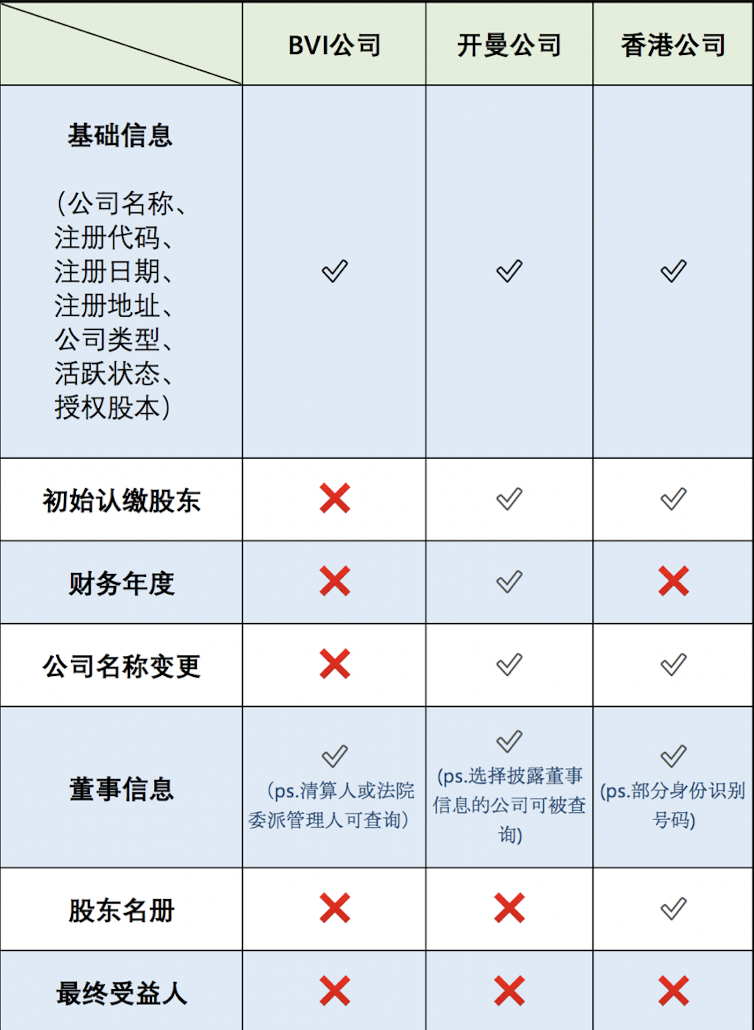 下表總結(jié)了BVI公司、開曼公司以及香港公司能從公開渠道查詢的信息,僅供參考。