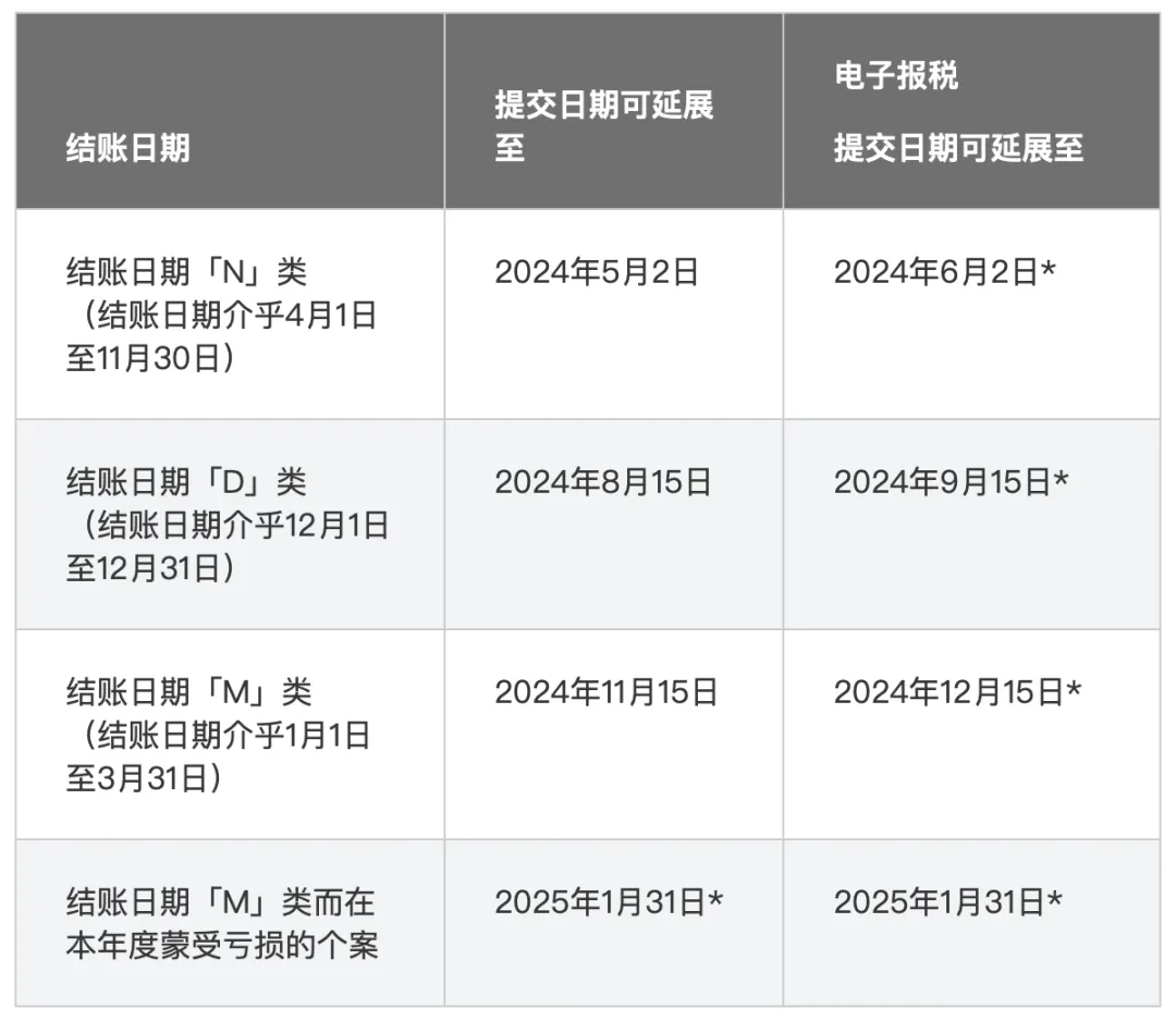 我們上文說,公司需要在收到稅表的一個月內(nèi)完成填報。但在實際申報過程中,若你的稅務代表在整批延期計劃下辦妥申請延期提交你的2023/24年度利得稅報稅表,則提交期限通常延展至下述日期: