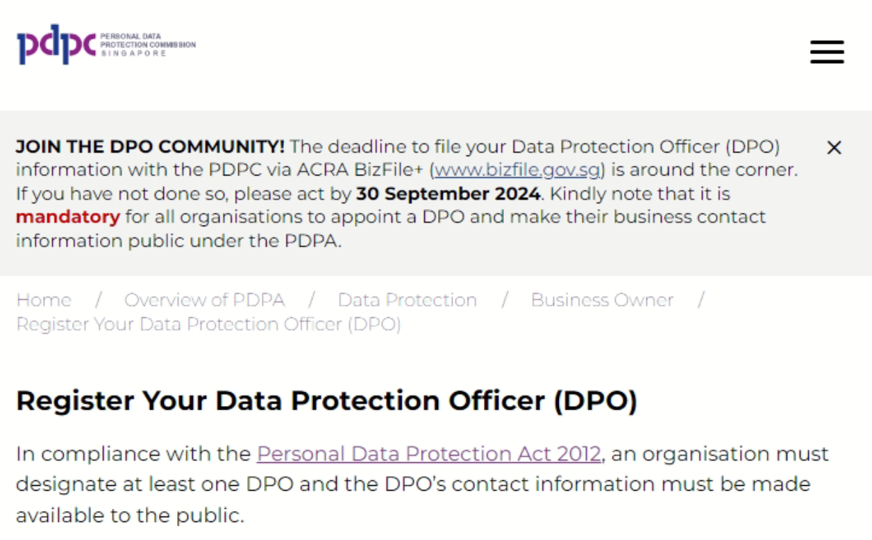 在此背景下,新加坡也發(fā)布了《個人資料保護(hù)法》(PDPA) ,其在最新一期修正案中規(guī)定:轄下所有公司必須指定至少一名數(shù)據(jù)保護(hù)官(DPO),并限期在2024年9月30日前完成。業(yè)務(wù)聯(lián)絡(luò)資訊可以是組織通用的電話或電子郵件地址。
