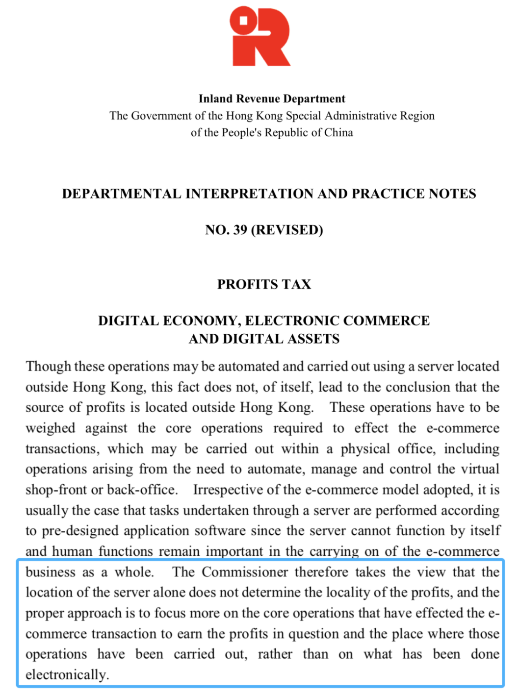 對(duì)此,香港稅務(wù)局于2020年更新了經(jīng)修訂的DIPN 39中的某些規(guī)則。明確了判斷標(biāo)準(zhǔn):如果主要核心操作在服務(wù)器中進(jìn)行,它將被視為永久性機(jī)構(gòu)(常設(shè)機(jī)構(gòu)),認(rèn)定其核心業(yè)務(wù)仍在香港執(zhí)行,需要繳納稅款。